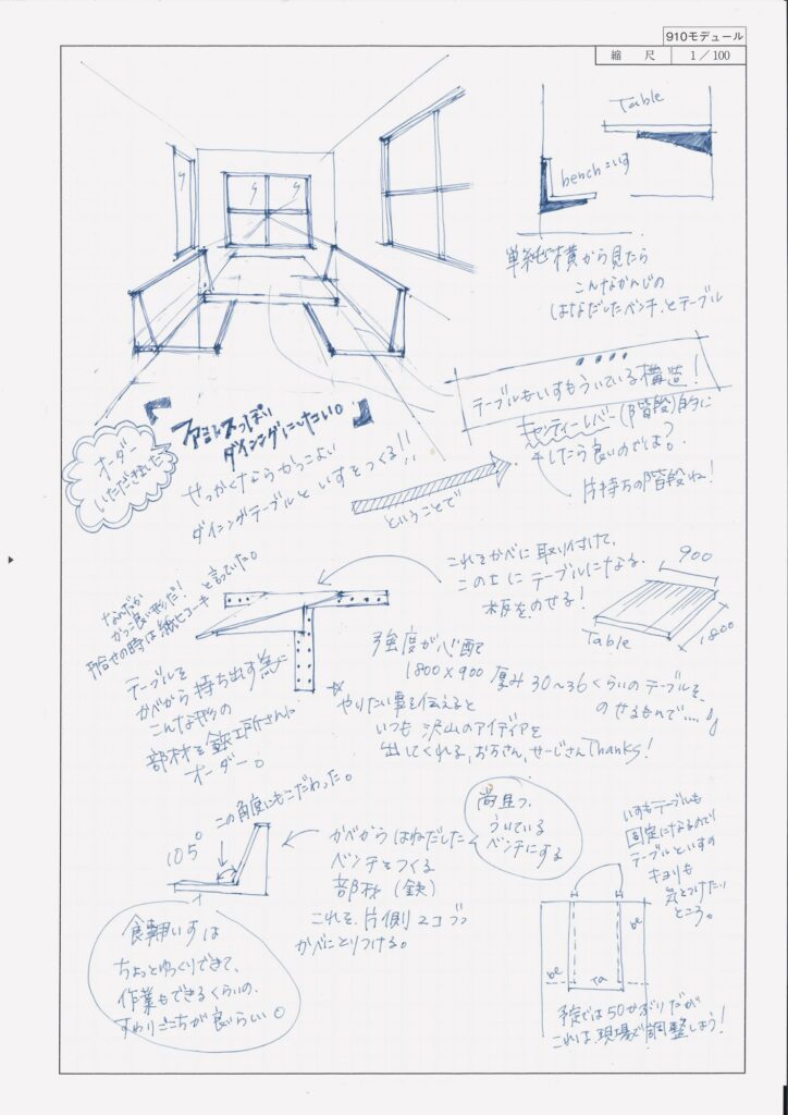 せっかくなら、ただ既製品を置いたり、造作のテーブルを造って椅子をぽーんと置くだけじゃない、“住宅作家らしい”答えを出したい。