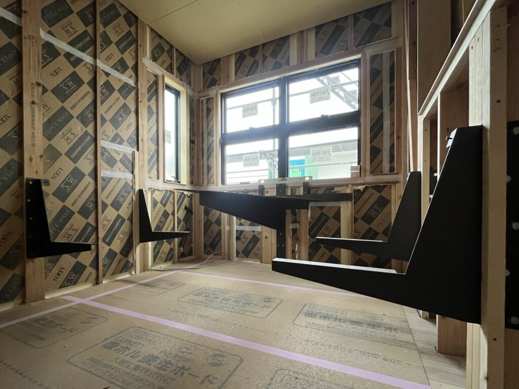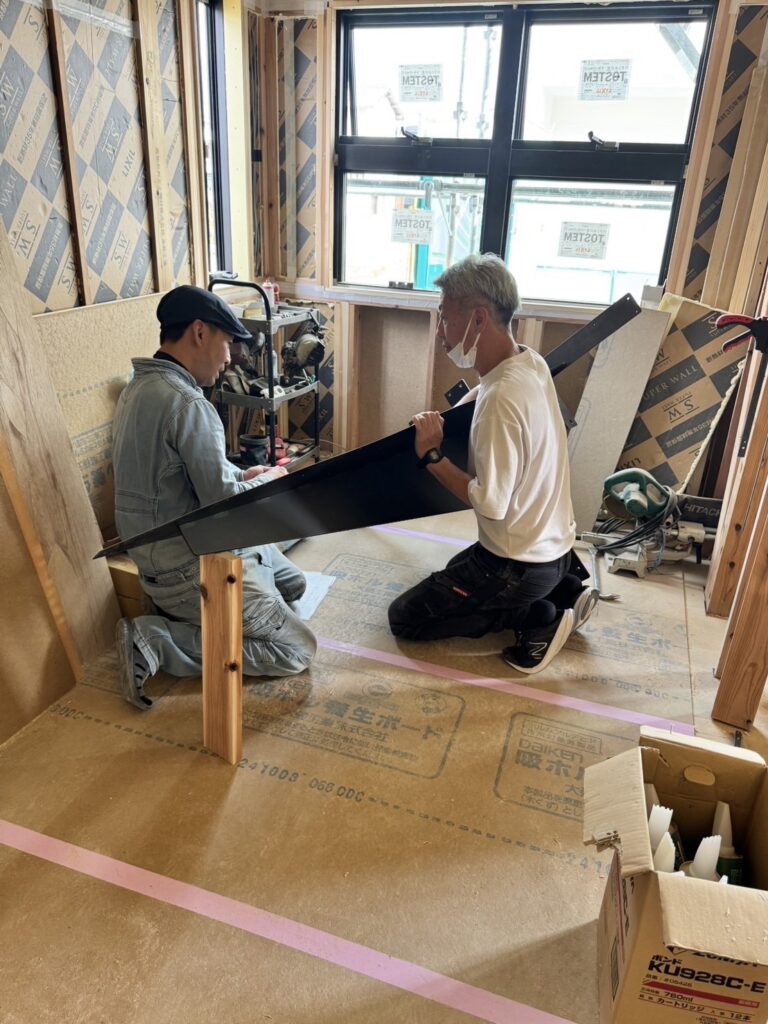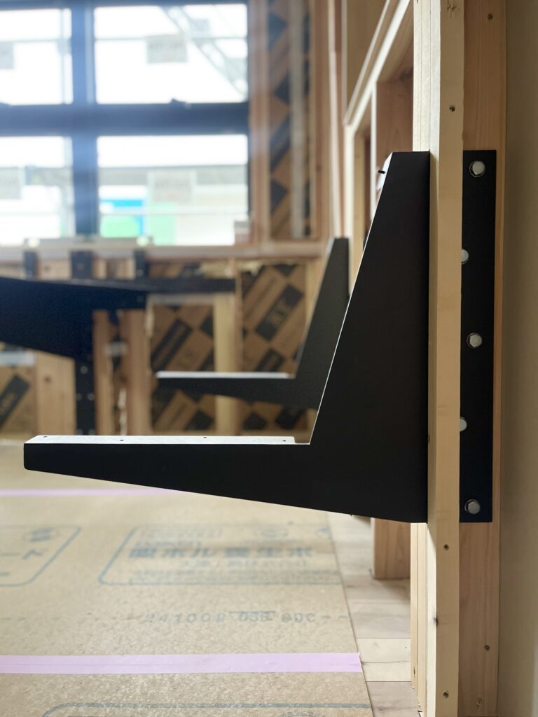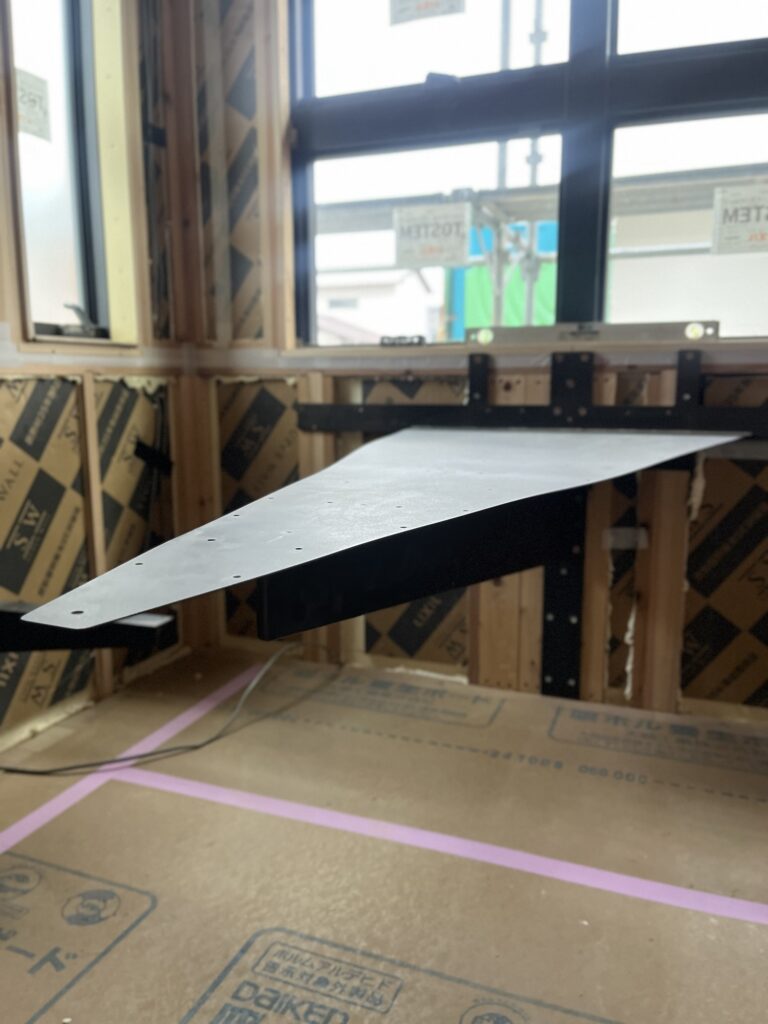 現場に取り付けられた黒皮の鉄骨。まだ天板がついていない状態でも、そのたたずまいがかっこいい。